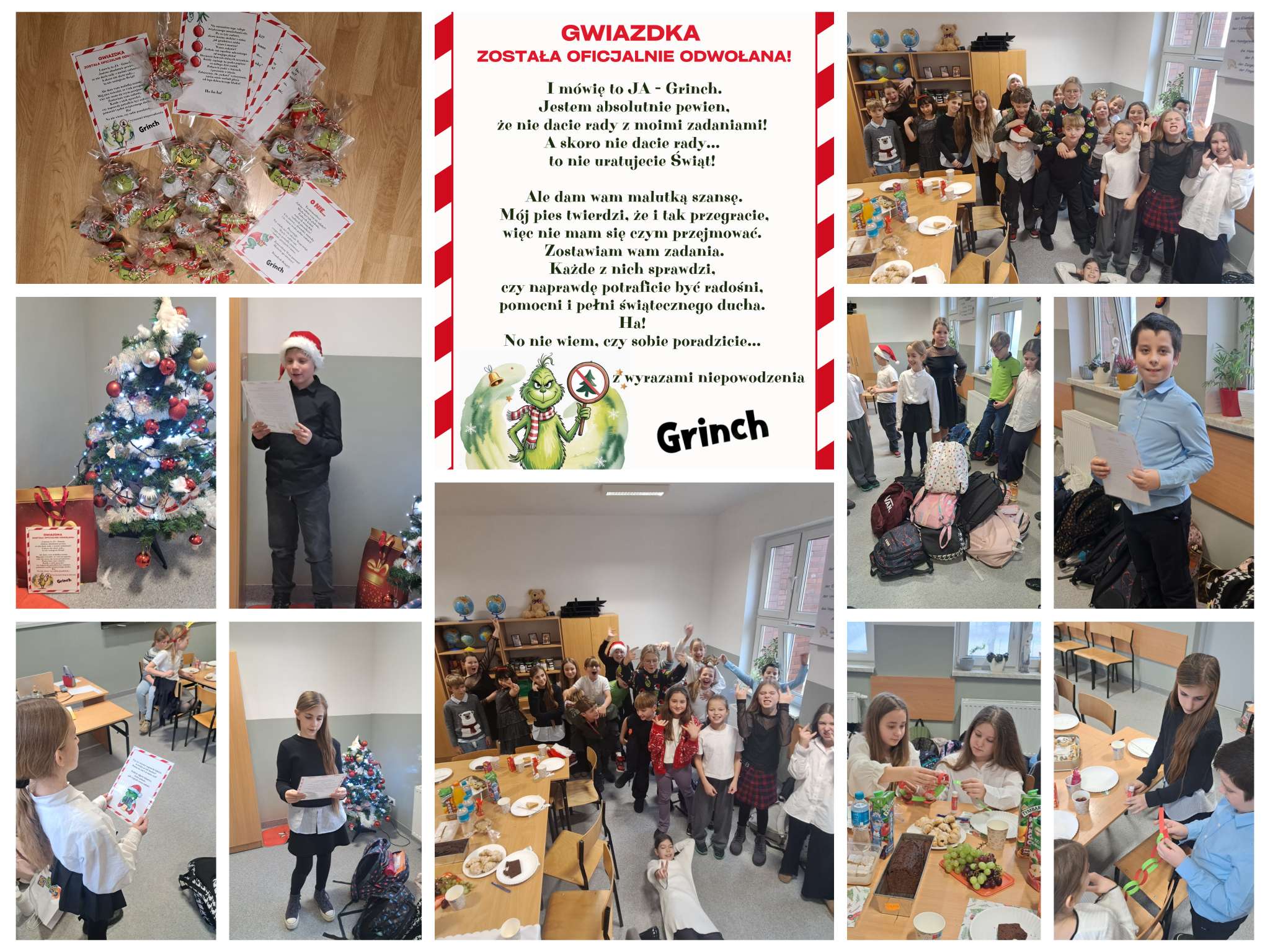 Klasa 4c wzięła na siebie ten trud! Gdy wszyscy zajęci byli zajadaniem się świątecznymi przysmakami i dzieleniem prezentami, oni dzielnie ratowali Święta przed złośliwym Grinchem
