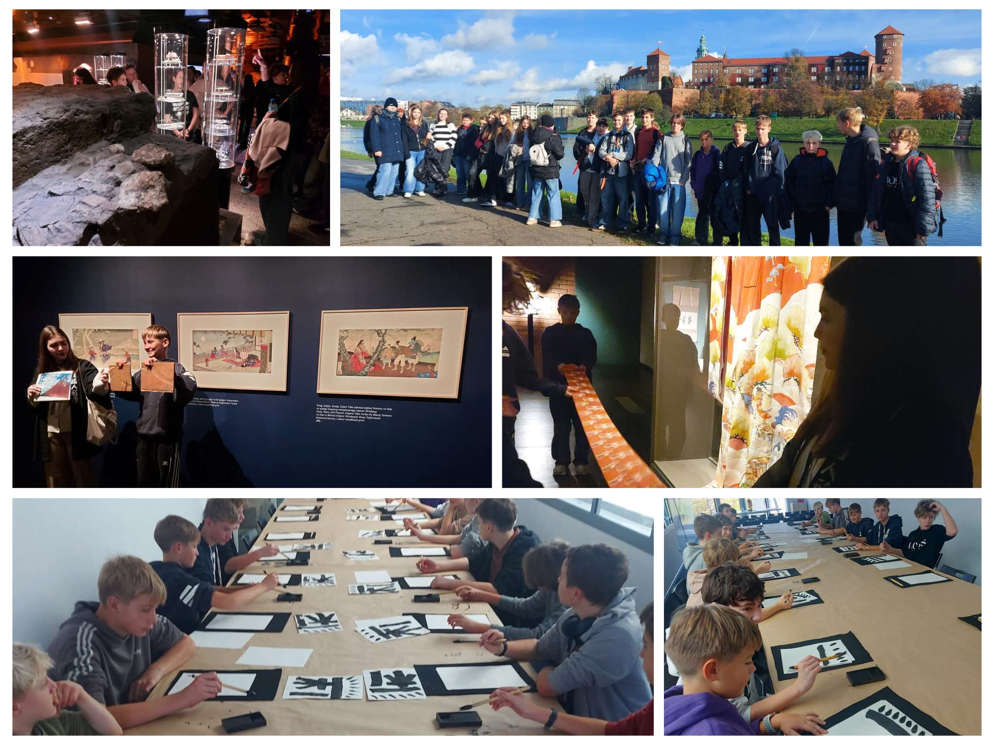 29 października klasa 7c wybrała się na wycieczkę do Krakowa pod opieką dwójki nauczycieli – Jakuba Biłuńskiego i Ewy Gnat. Kraków przywitał klasę i opiekunów piękną pogodą, a zwiedzanie Muzeum Sztuki i Techniki Japońskiej Manggha i związane z nim warsztaty okazały się inspirującym doświadczeniem. Kultura japońska fascynuje wielu uczniów, co można było zobaczyć m.in. podczas ich pracy nad kaligrafią tuszem i podziwiania drzeworytów wybitnego japońskiego artysty działającego pod koniec okresu Meiji (1868–1912) – Mizuno Toshikaty (1866–1908). Następnie uczniowie ruszyli wzdłuż Wawelu na spotkanie z panią przewodnik, która zabrała klasę na intensywny spacer po ścisłym centrum miasta. Kluczowym elementem spaceru było zwiedzanie wystawy „Śladem europejskiej tożsamości Krakowa” w Muzeum Podziemia Rynku Głównego. Multimedialne widowisko przeniosło uczniów w podróż przez krakowską historię, koncentrując się na jej europejskim znaczeniu i kulturze handlowej. Było to znakomite podsumowanie wycieczki, która na długo pozostanie w pamięci.
