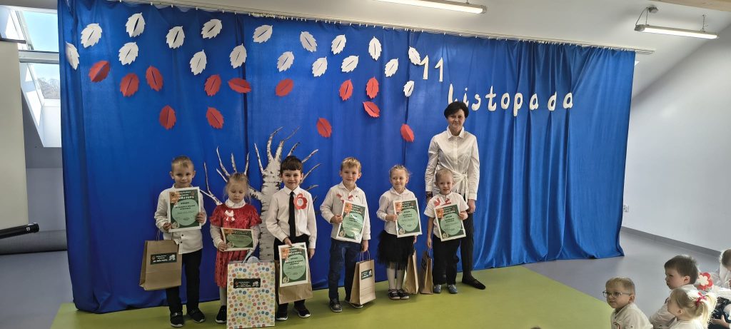 Z przyjemnością ogłaszamy, że nasze przedszkolaki w składzie: Jędzierowski Karol, Zofia Majka Drążewski Tymoteusz, Aleksandra Wiącek, Jagoda Siemiec, Anna Pszała, Julia Korzeniowska oraz Jaś Sochacki, pod opieką Pani Agnieszki Kupczyk, zajęli 1 miejsce w konkursie piosenki patriotycznej pt. „POLSKA – UKOCHANA OJCZYZNA NASZA” organizowanym przez Przedszkole Miejskie nr 20 w Gliwicach. Dzieci wystąpiły jako zespół pt. „Mali Patrioci z Żernik” i zaprezentowały piosenkę „Polska – moje miejsce na Ziemi”. Serdecznie gratulujemy!