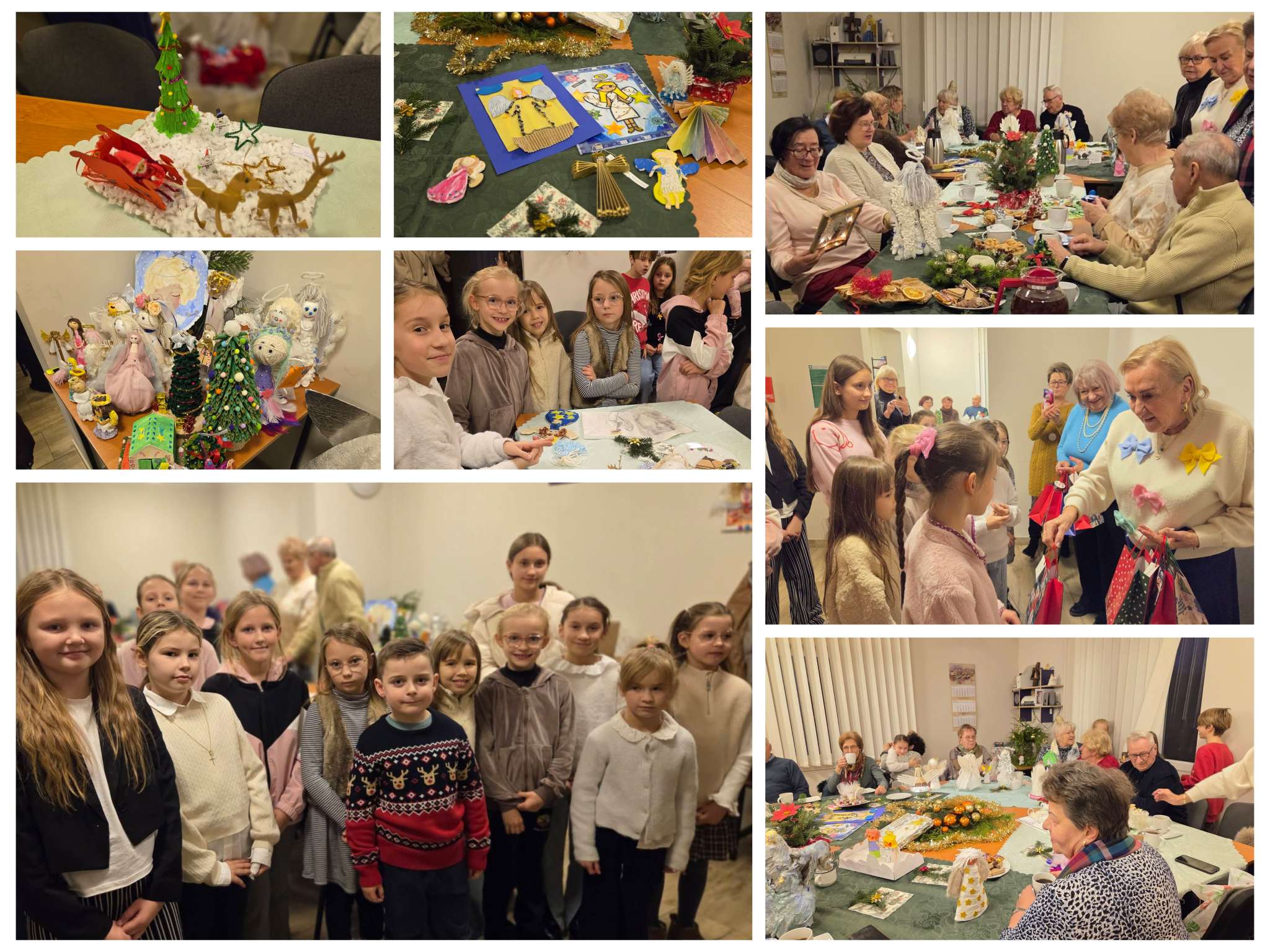 Wizyta naszch uczniów związana była z finałem dwóch konkursów szkolnych: DO SZKOŁY PRZYLECIAŁY ANIOŁY i OZDOBA ŚWIĄTECZNA. Prace konkursowe były prezentem z okazji zbliżających się Świąt Bożego Narodzenia dla naszych Seniorów. Zostaliśmy niezwykle miło ugoszczeni. Uczniowie nie tylko przynieśli prezenty, ale zostali również obdarowani, otrzymując słodkie podarunki i ozdoby na choinkę wykonane przez naszych Gospodarzy. Było to bardzo sympatyczne i radosne spotkanie.